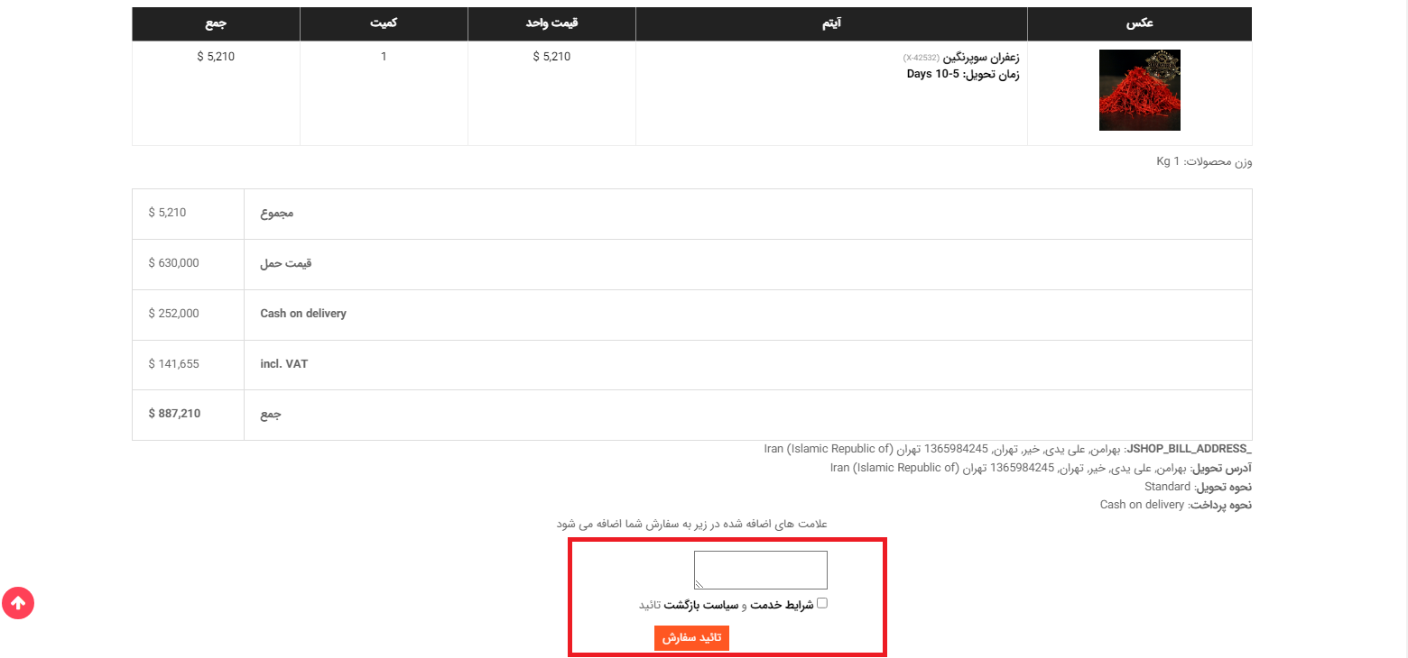 و در این صفحه اگر توضیحاتی درباره محصول دارید را ذکر می نمایید و در آخر با انتخاب دکمه تایید سفارش به صفحه پرداخت هدایت می شوید و فاکتور خرید خود را دریافت می کنید و در آخر محصول در بازه زمانی ۵ - ۱۰ روز کاری به دستتان می رسد.